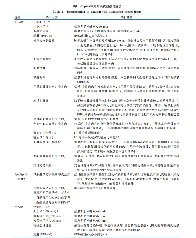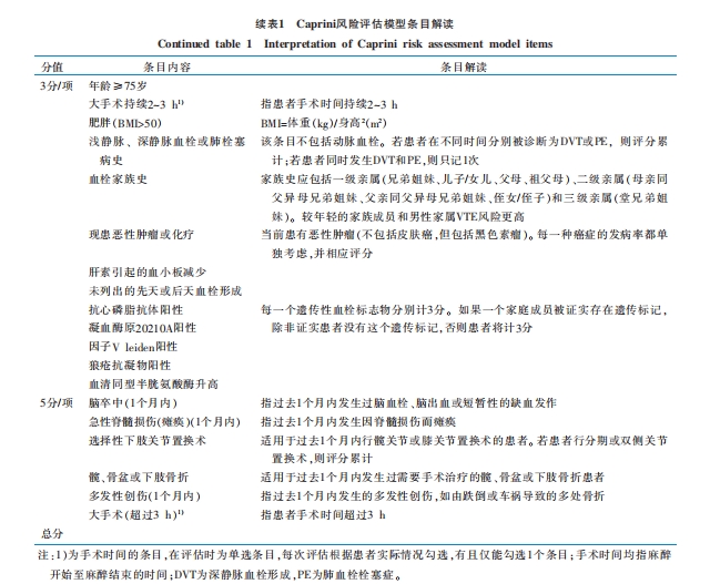 建議對所有普通外科患者進行VTE風(fēng)險評估,基于臨床經(jīng)驗和大量的循證醫(yī)學(xué)證據(jù),推薦使用Caprini風(fēng)險評估模型,對普通外科患者進行VTE風(fēng)險評估。Caprini風(fēng)險評估模型涵蓋了住院患者常見的各類VTE風(fēng)險因素,該模型在世界范圍內(nèi)廣泛運用并在中國人群中得到了驗證。2016年發(fā)表的《中國普通外科圍手術(shù)期血栓預(yù)防與管理指南》中,明確推薦使用Caprini風(fēng)險評估模型評估普通外科圍手術(shù)期患者的VTE發(fā)生風(fēng)險。建議護理人員通過查閱病歷問診、查體,實驗室檢查等方法,獲取全面且準(zhǔn)確的患者疾病信息,并在正確理解Caprimi風(fēng)險評估模型各條目含義(表1)的基礎(chǔ)上,對患者進行VTE風(fēng)險評估,以提高風(fēng)險評估結(jié)果的準(zhǔn)確性和有效性。此外國際標(biāo)準(zhǔn)化比值,D-二聚體等凝血指標(biāo)可以動態(tài)體現(xiàn)患者的凝血功能情況,當(dāng)患者病情平穩(wěn),而D-二聚體進行性升高時,應(yīng)當(dāng)警惕VTE的發(fā)生。建議護理人員在對普通外科患者進行VTE風(fēng)險評估時,持續(xù)關(guān)注患者的國際標(biāo)準(zhǔn)化比值,D-二聚體等實驗室指標(biāo)變化,以達到VTE預(yù)警監(jiān)測的目的。