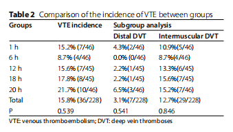 結(jié)果:230例患者中有2例因提前出院而退出治療,228例患者被納入最終分析。平均年齡為60.38±13.33歲。五組間的基線特征具有可比性。與其他組相比,6小時VFP治療的患者DVT發(fā)生率最低(8.7%,4/46),其次是1小時VFP(15.2%,7/46)、12小時VFP(15.6%,7/45)、18小時VFP(17.8%,8/45)和20小時VFP(21.7%,10/46),但無統(tǒng)計學(xué)差異(P=0.539)。在術(shù)后凝血檢查方面,與其他四組相比,接受6小時VFP治療的患者d-二聚體最低(P=0.658),APTT最高(P=0.262)。與其他四組相比,6小時VFP的疼痛評分最低(P=0.206)和舒適性評分最高(P=0.288)。
