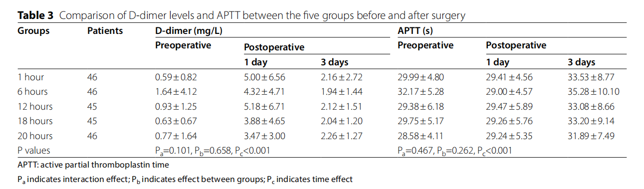 與術(shù)前1天相比,D-二聚體在術(shù)后1天顯著升高,并且在術(shù)后3天顯著降低(P<0.001,表3;圖4A)。接受6小時VFP治療的患者d-二聚體在五組中最低,但無統(tǒng)計學(xué)差異(P=0.658)。與其他組相比,接受6小時VFP治療的患者的APTT也最高(P=0.262)(圖4B)。以上結(jié)果表明,VFP應(yīng)用的5個持續(xù)時間對VTE均有良好的預(yù)防作用。