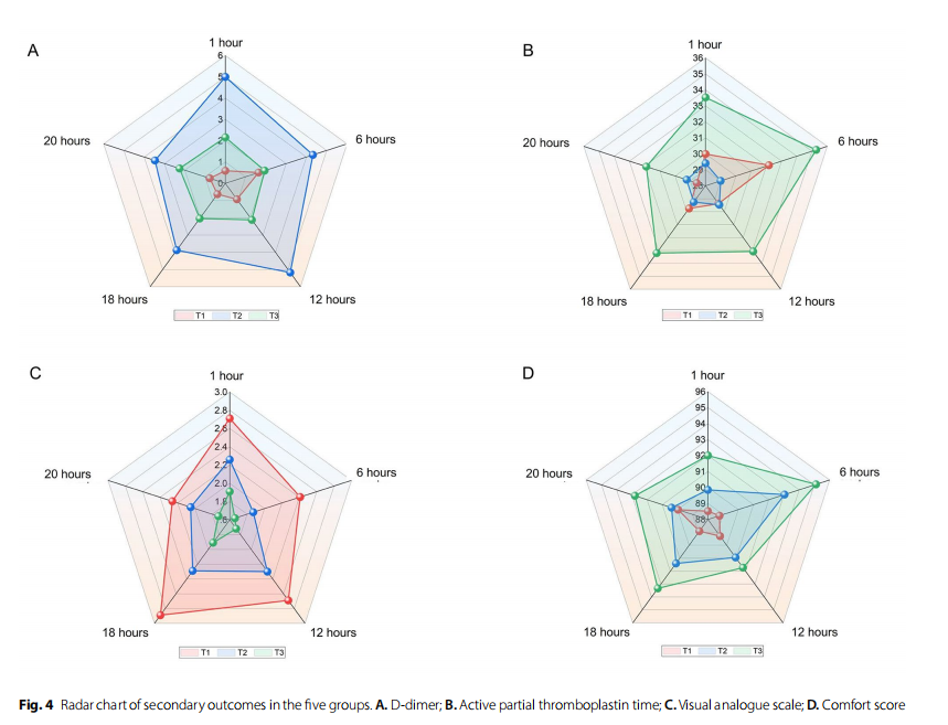 方法:前瞻性納入2021年3月至2022年3月在四大教學(xué)醫(yī)院骨科行髖關(guān)節(jié)和膝關(guān)節(jié)置換術(shù)的230例患者。根據(jù)VFP應(yīng)用時間將患者隨機分為5組。記錄術(shù)后深靜脈血栓形成(DVT),包括近端、遠端和肌間DVT,以進行分析。術(shù)后收集術(shù)后凝血檢查,如d-二聚體和活性部分凝血酶時間(APTT)、疼痛結(jié)果和舒適程度。