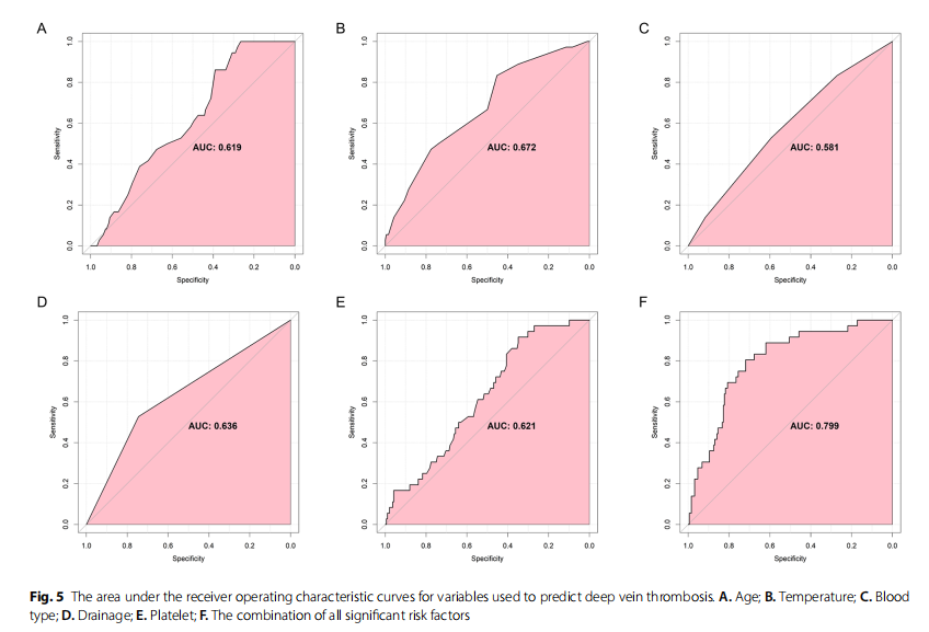 多因素分析顯示,年齡(P=0.036)、高體溫(P=0.018)、低SBP(P=0.016)、AB(P=0.046)或B(P=0.021)血型、引流(P=0.045)、低血小板計數(shù)(P=0.047)與DVT呈顯著正相關(guān)(表5)。年齡、體溫、血型、引流液、血小板計數(shù)和所有顯著危險因素組合的AUROC分別為0.619、0.672、0.581、0.636、0.621和0.799(圖5A-F)。以上結(jié)果表明,這些變量是深靜脈血栓的良好預(yù)測因素。