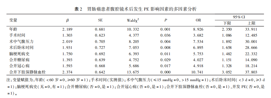 將單因素分析中差異有統(tǒng)計學(xué)意義的年齡、手術(shù)時間、術(shù)中氣腹壓力、術(shù)后臥床時間、腦梗死病史、合并糖尿病、合并冠心病、合并下肢深靜脈血栓作為自變量,胃腸癌患者腹腔鏡術(shù)后是否并發(fā)PE作為因變量,進(jìn)行多因素 Logistic回歸分析。 分析結(jié)果顯示,年齡≥ 60歲、手術(shù)時間長、術(shù)中氣腹壓力 > 15 mmHg、術(shù)后臥床時間≥3d、有腦梗死病史、合并糖尿病、合并冠心病、合并下肢深靜脈血栓均是導(dǎo)致胃腸癌患者腹腔鏡術(shù)后發(fā)生PE的獨立危險因素(P< 0.05)(表 2)。